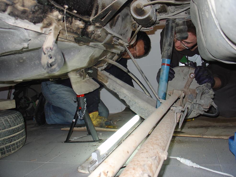 Una última foto en la que se puede ver arriba el anclaje de la barra Panhard, una de las cuatro borriquetas que sostenían el coche y el gato sujetando el eje para que no cayera de golpe.