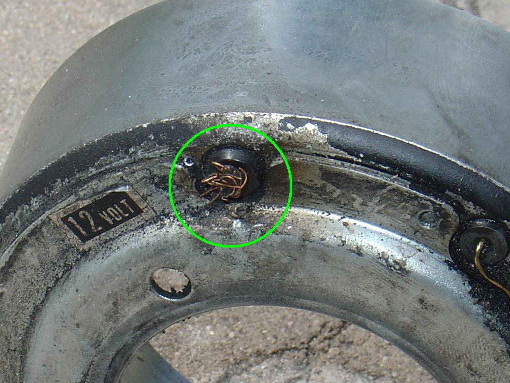 El aire acondicionado funcionaba unas veces si y otras no. "Debe ser una avería en el compresor, búscate uno nuevo" .. :? Tras indagar un poco y gracias a Paco de Rogasanz, comprobamos que el compresor estaba bien, pero el problema era que tenía roto el cable que le hace llegar electricidad al bobinado. Como se puede ver en las fotos es imposible acceder al hueco estrecho en el que se mete el cable, para poder soldar o hacer algún tipo de apaño. Originalmente viene enfundado en una malla, que con el paso de los años y el uso acaba por romperse. He intentado siluetear el cable.
